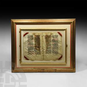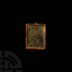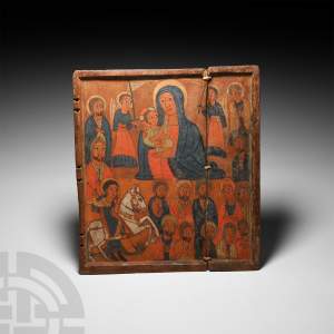 16th century A.D. A rectangular wooden panel with recess to one face, painted scene of Virgin and Child with various saints in the field. 400 grams, 31.5 cm high (12 3/8 in). Acquired 2000. Mondoloni collection, London, UK. [No Reserve] Fine conditio...
