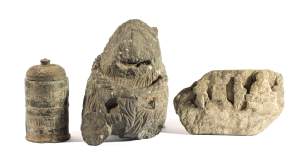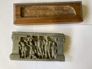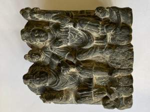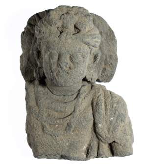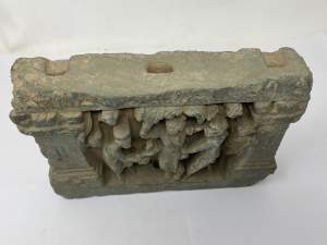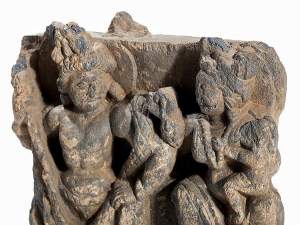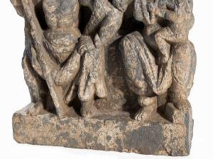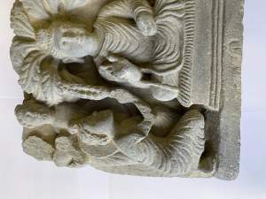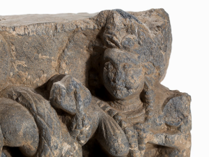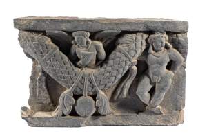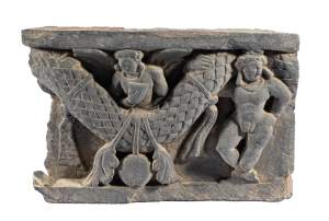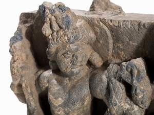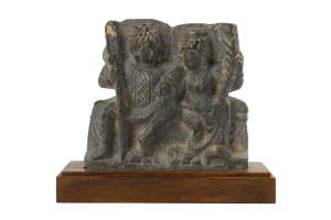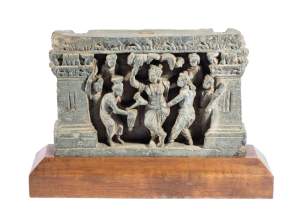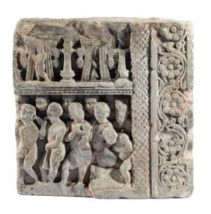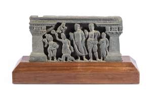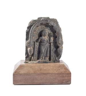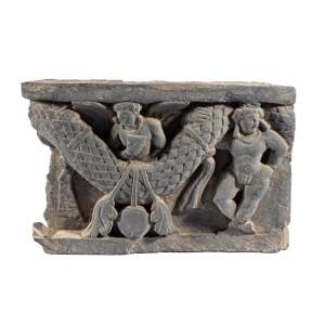 A GANDHARA GREY SCHIST RELIEF PANEL, NORTH-WESTERN PAKISTAN, 3RD/4TH CENTURY depicting Hariti with child and attendants, flanked by a pair of Corinthian columns, an acanthus frieze along the top, mounted, 18 x 26 x 5.5cm Provenance: Formerly property...