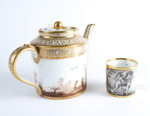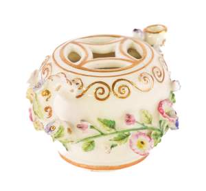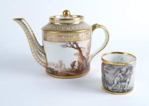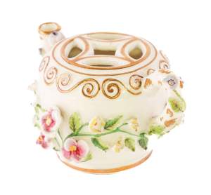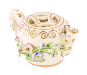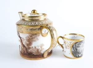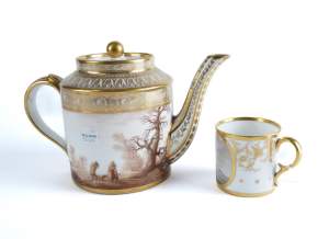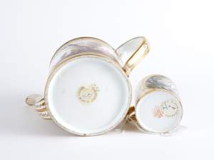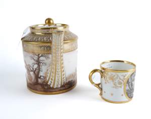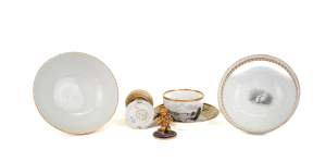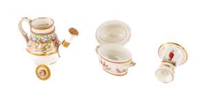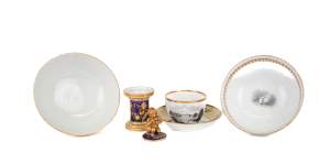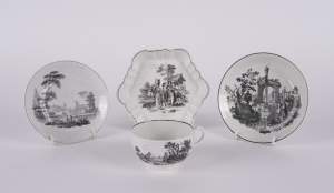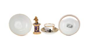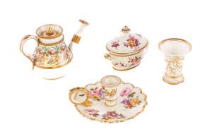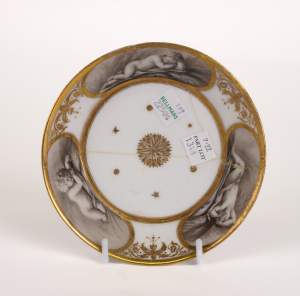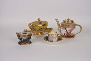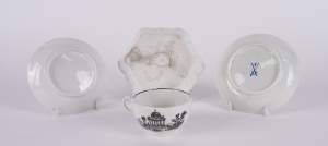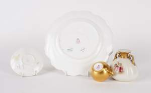 A SMALL GROUP OF ROYAL WORCESTER PORCELAIN PAINTED WITH FRUIT (4) Comprising; a squat two-handled vase, circa 1924, signed Ricketts, 9cm high; a plate painted by T. Lockyer, circa 1924, with wavy gilt gadroon moulded rim, 22.5cm diameter; a coffee cu...