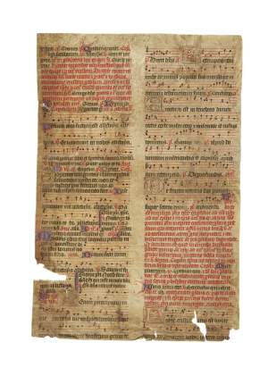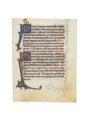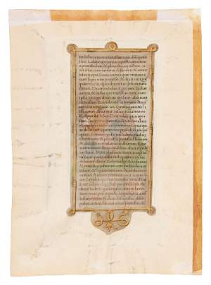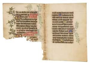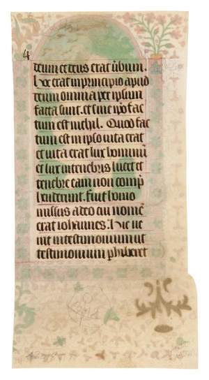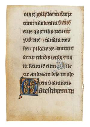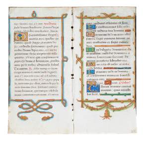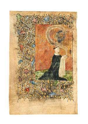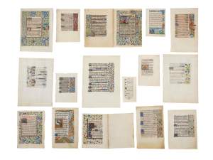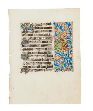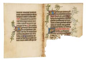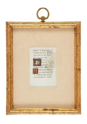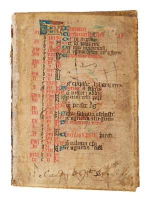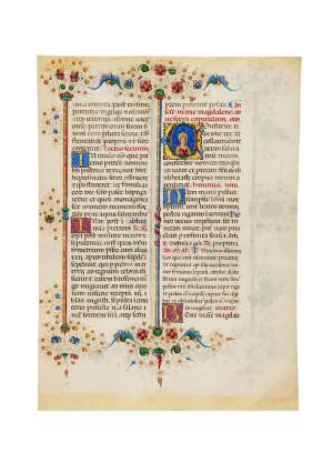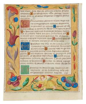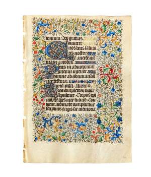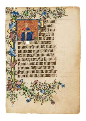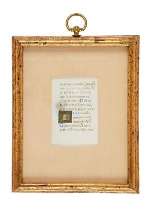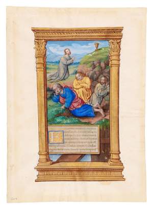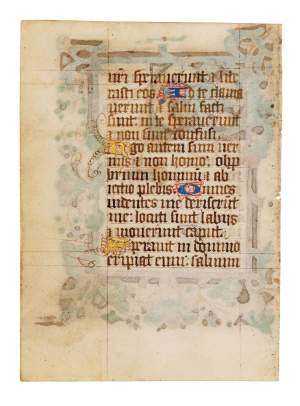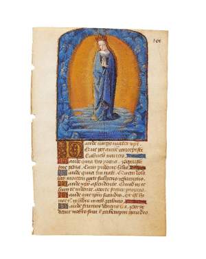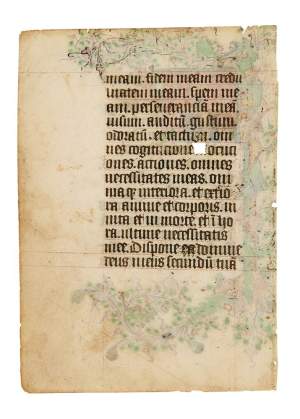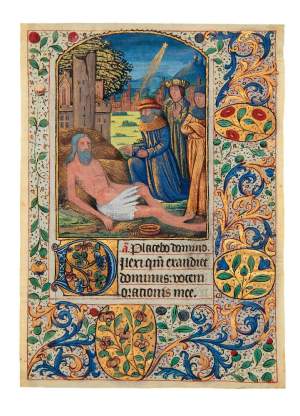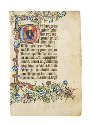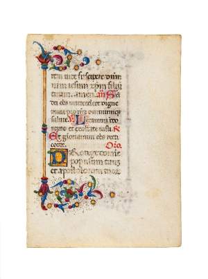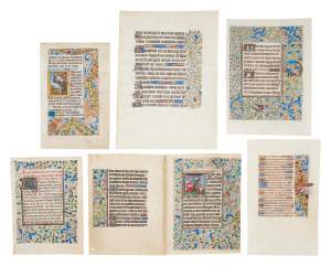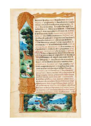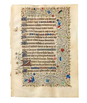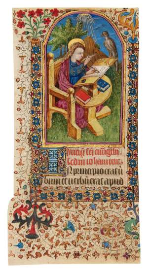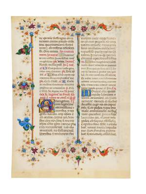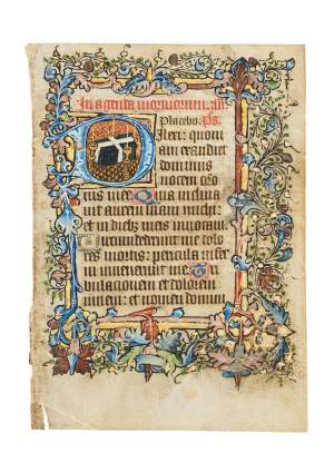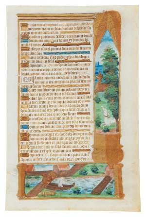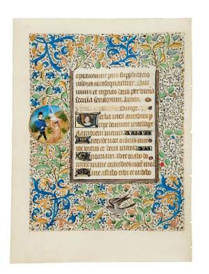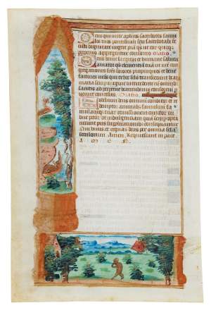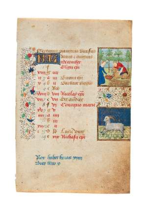 Calendar leaf for December, from a Book of Hours, in Latin, illuminated manuscript on parchment [Southern Netherlands (Bruges, for the British market), c. 1460] Single leaf, with two small square miniatures (each approximately 33mm. high), showing (i...