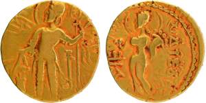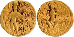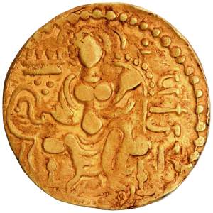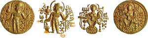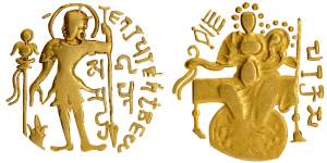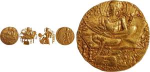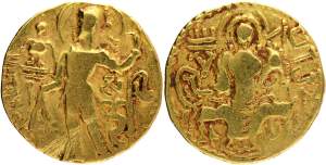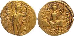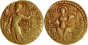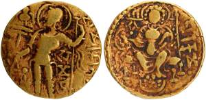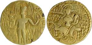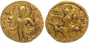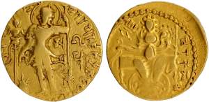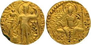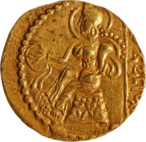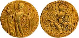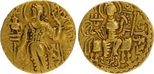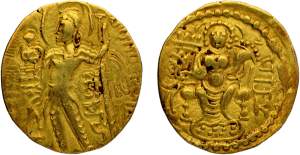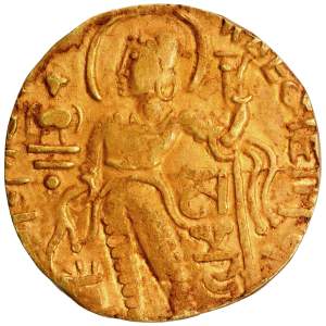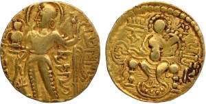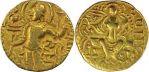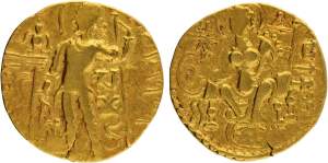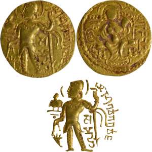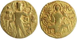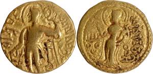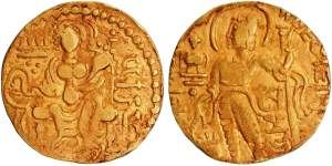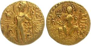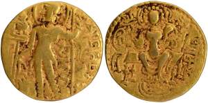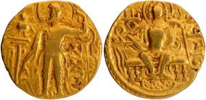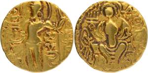 Gupta Empire, Samudragupta (335-370 AD), Gold Dinar, Sceptre Type (Standard), Obv: king nimbate, standing facing left, holding standard and sacrificing over altar, garuda standard behind, brahmi legend at left "Samudra", Rev: goddess lakshmi nimbate,...