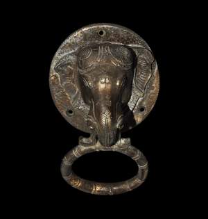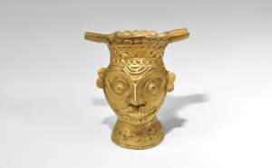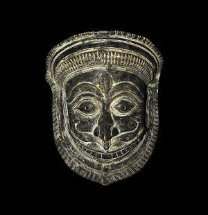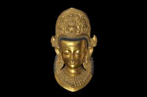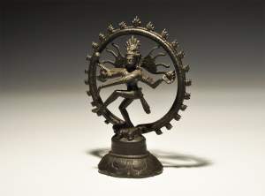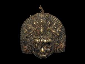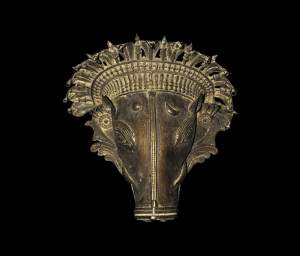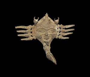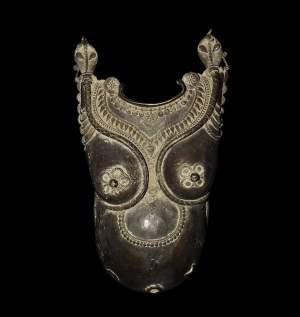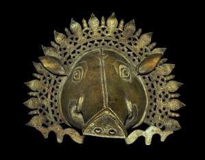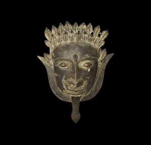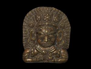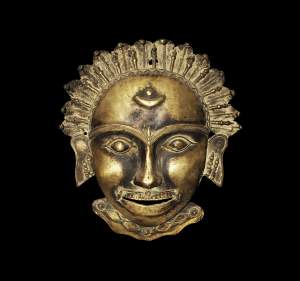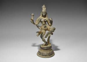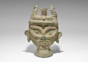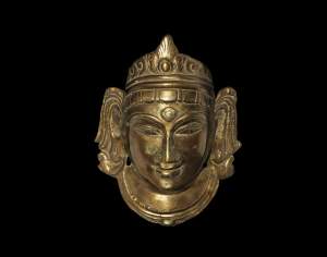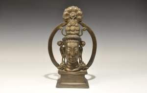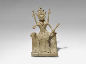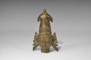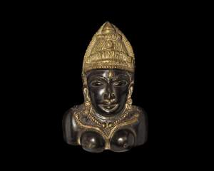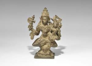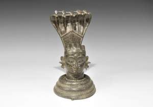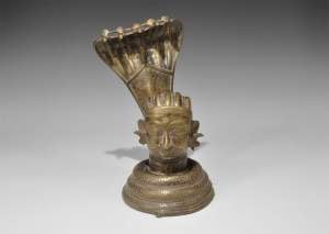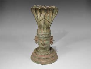 India, 19th-early 20th century AD. Cast bronze figure of the Hindu goddess Manasa Devi with applied decoration, four arms and seated on a throne; on her crown are five rearing cobras, another at her forehead, one round her neck and one by her left fo...